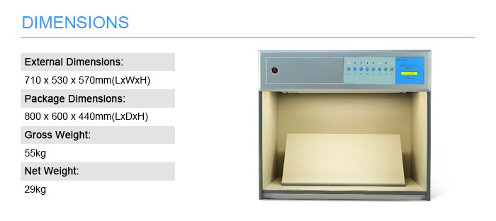 : I colori appaiono in modo diverso a seconda delle fonti di illuminazione. Per evitare/ridurre l'errore di valutazione durante l'esecuzione del contrasto cromatico, possiamo utilizzare una cabina di illuminazione/cabina di visualizzazione/scatola luminosa per simulare diverse fonti di luce e ottenere una valutazione oggettiva del colore e delle differenze cromatiche, sempre e ovunque.
